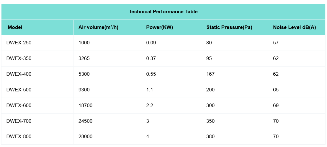 | Model | Air volume(m³/h) | Power(KW) | Static Pressure(Pa) | Noise Level dB(A) |