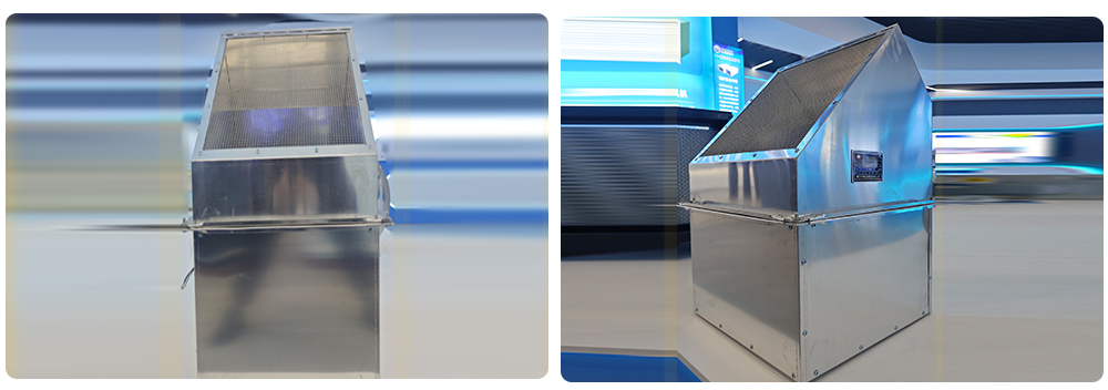 The DWEX series fans are typically utilized for sidewall exhaust applications and are equipped with a 45° rain hood (or optionally custom-manufactured with a 60° angle) and an insect screen (to prevent insects from flying into the workshop at night, attracted by the lighting). Upon request, these units can be configured as sidewall supply fans—designated as model DWSP (WSP)—which feature a 90° rain hood (providing protection against wind, rain, and dust) and an insect screen (to prevent insects from flying into the workshop at night, attracted by the lighting).