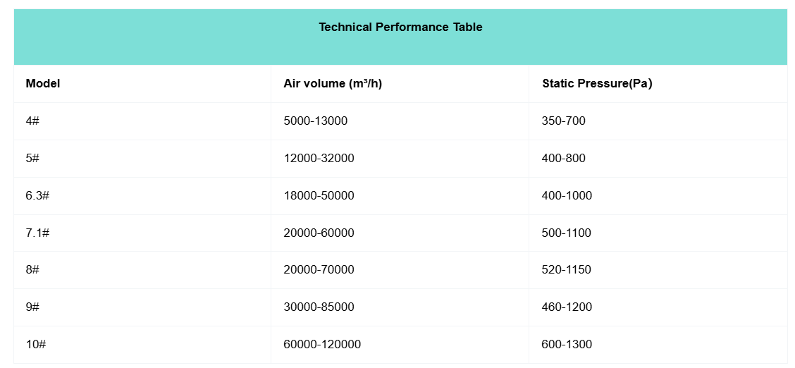 | Model | Air volume (m³/h) | Static Pressure(Pa) |
