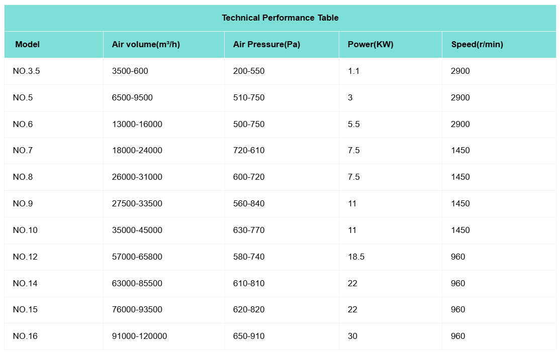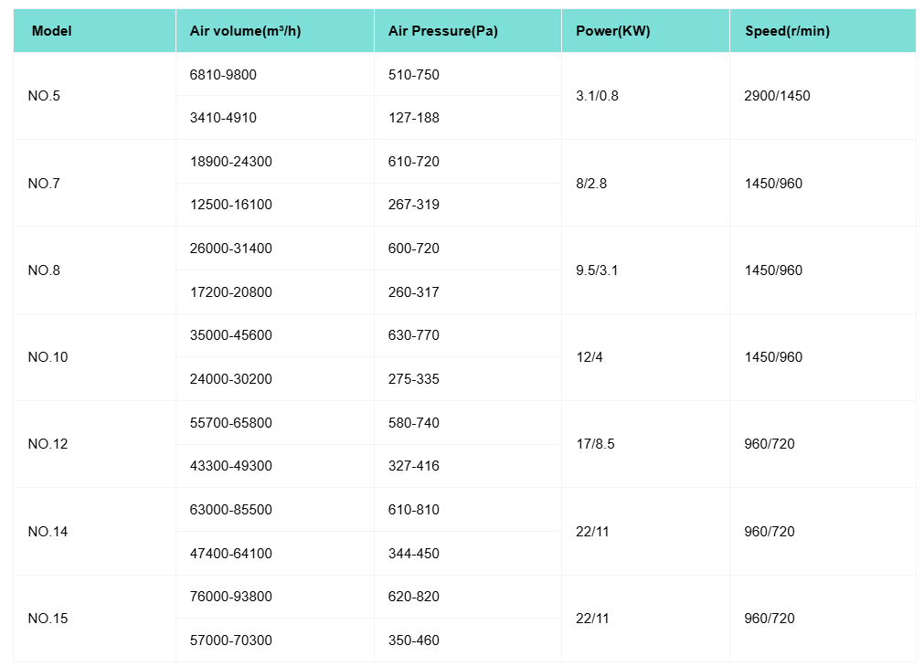 | Model | Air volume(m³/h) | Air Pressure(Pa) | Power(KW) | Speed(r/min) |
